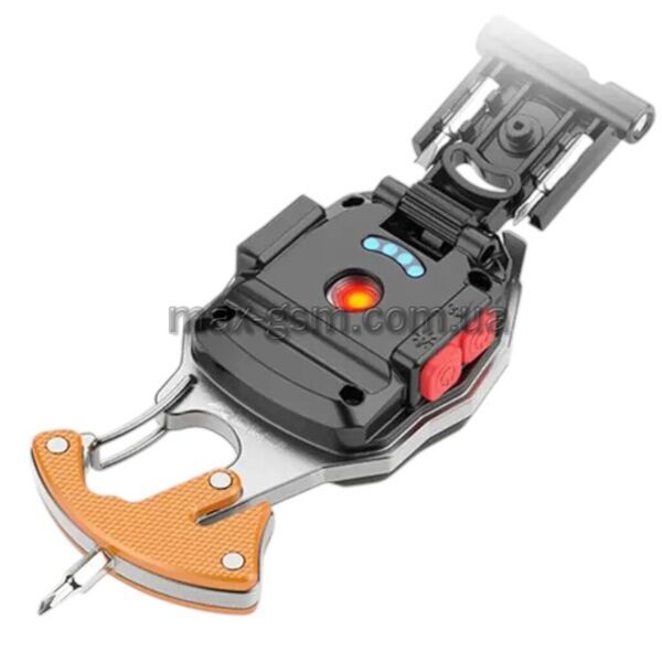 мультифункціональний ліхтар, свисток, магніт, карабін, викрутка, прикурювач, стропоріз, відкривалка, індикація заряду